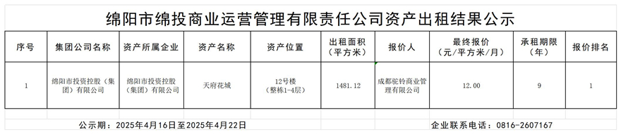 绵阳市williamhill官网商业运营管理有限责任公司资产出租结果公示