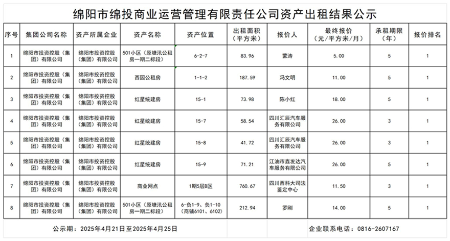 绵阳市williamhill官网商业运营管理有限责任公司资产出租结果公示