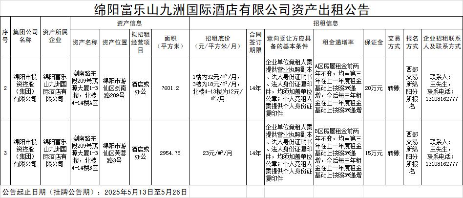 绵阳富乐山九洲国际酒店有限公司资产出租公告