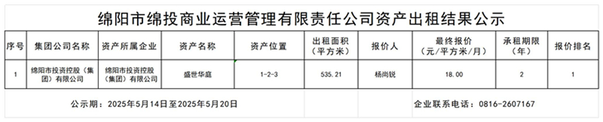 绵阳市williamhill官网商业运营管理有限责任公司资产出租结果公示