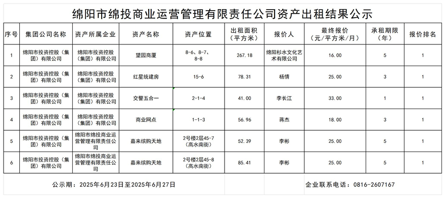 绵阳市williamhill官网商业运营管理有限责任公司资产出租结果公示