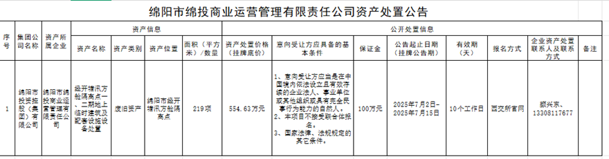 绵阳市williamhill官网商业运营管理有限责任公司资产处置公告