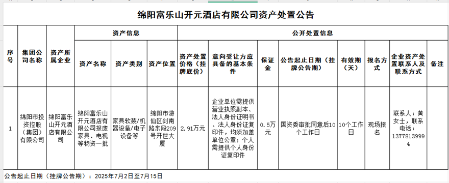 绵阳富乐山开元酒店有限公司资产处置公告