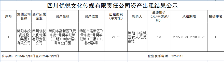 四川优悦传媒有限责任公司资产出租结果公示