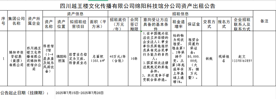四川越王楼文化传播有限公司资产出租公告