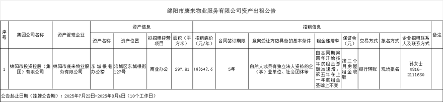绵阳市康来物业服务有限公司资产出租公告