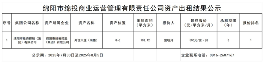 绵阳市williamhill官网商业运营管理有限责任公司资产出租结果公示
