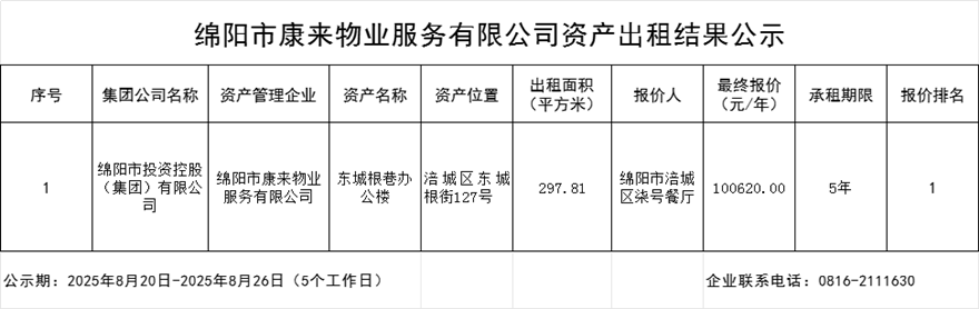 绵阳市康来物业服务有限公司资产出租结果公示