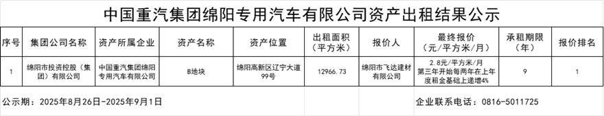 中国重汽集团绵阳专用汽车有限公司资产出租结果公示