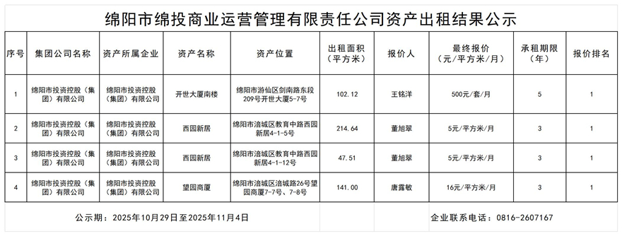 绵阳市williamhill官网商业运营管理有限责任公司资产出租结果公示