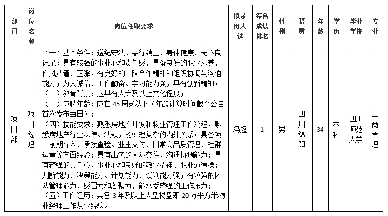 根据绵阳市康来物业服务有限公司发布的招聘公告及招聘相关规定,经笔试、面试、背景调查等程序,拟录用冯超同志到绵阳市康来物业服务有限公司项目部工作,现予以公示,具体情况如下: