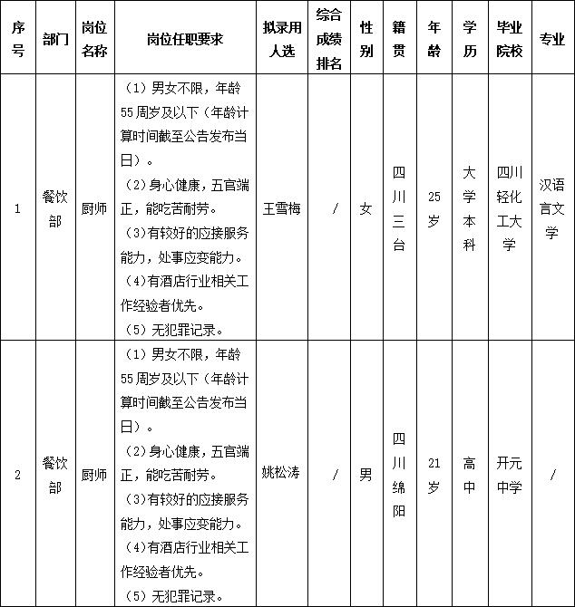 根据绵阳市东津酒店管理有限责任公司发布的招聘公告及招聘相关规定,通过面试等程序,拟录用王雪梅等同志到餐饮部工作,现予以公示,具体情况如下: