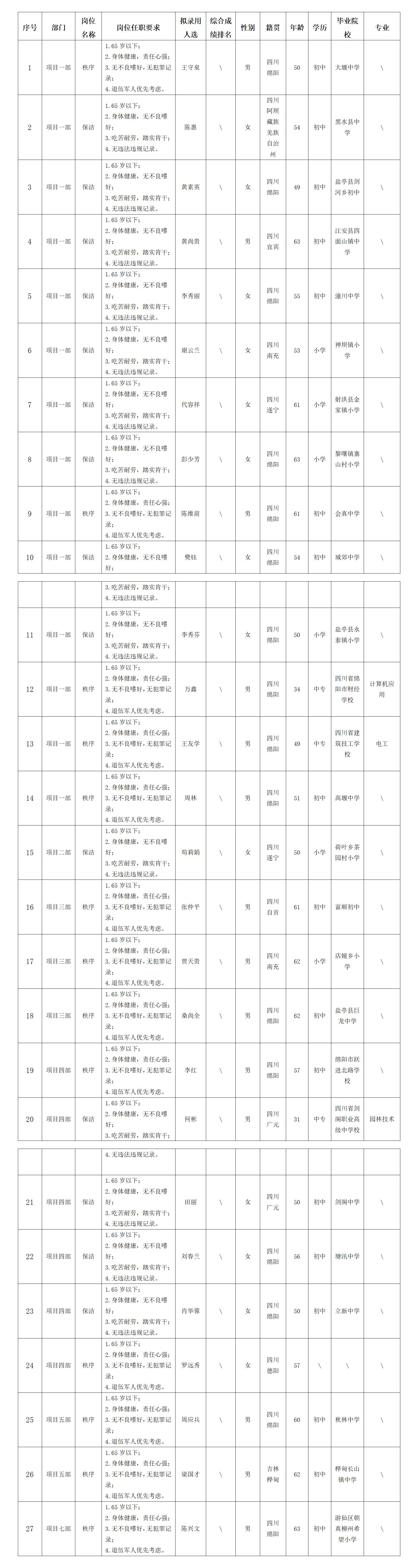 根据绵阳市康来物业服务有限公司发布的招聘公告及招聘相关规定,经面试等程序,拟录用王守泉等同志到各项目部工作,现予以公示,具体情况如下: