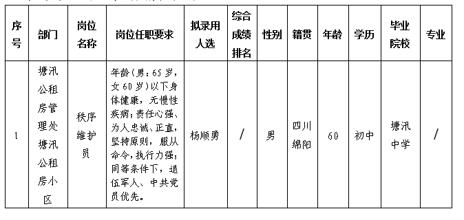 根据康居公司发布的长期招聘一线勤杂人员的招聘公告相关规定,经面试、体检等程序,拟录用杨顺勇同志到绵阳市康居房产经营管理有限公司塘汛公租房管理处塘汛公租房小区工作,现予以公示,具体情况如下: