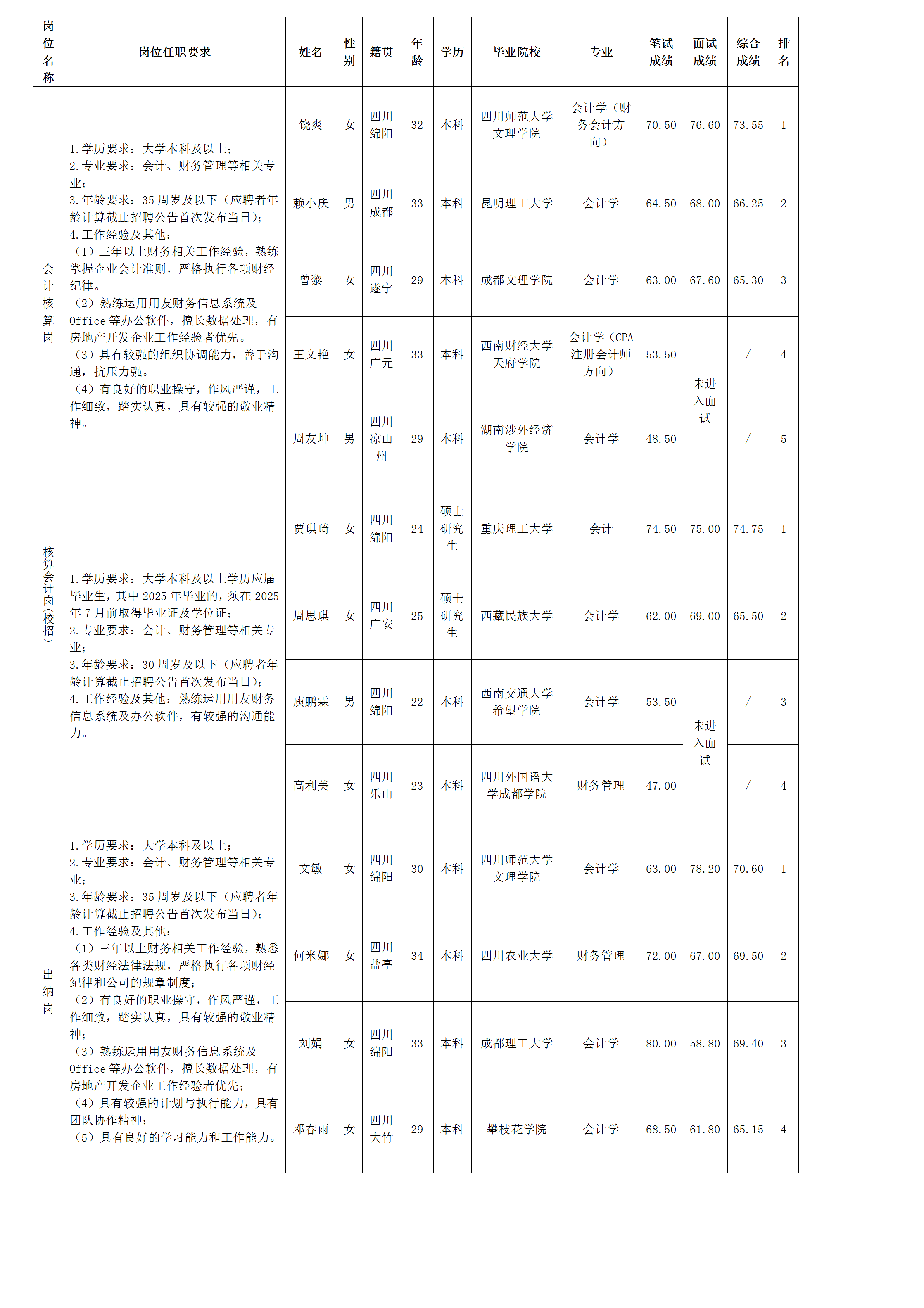 根据绵阳市williamhill官网置地有限公司发布的招聘公告及招聘相关规定,经笔试、面试等程序,现将笔试、面试成绩予以公示。