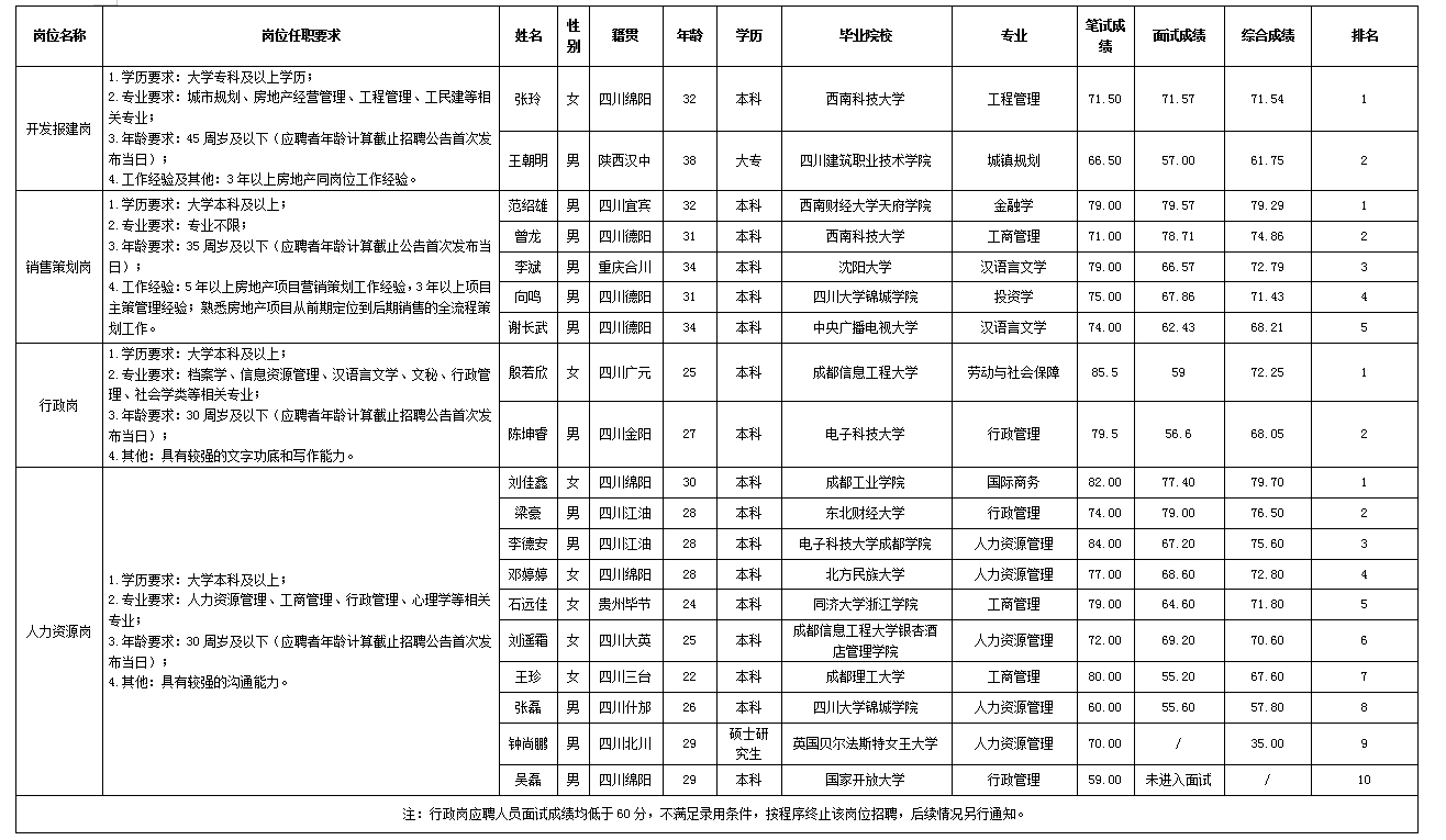 根据绵阳市williamhill官网置地有限公司发布的招聘公告及招聘相关规定,经笔试、面试等程序,现将笔试面试成绩予以公示。