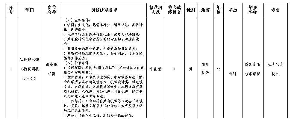 根据绵阳市城市停车管理有限公司发布的招聘公告及招聘相关规定,经笔试、面试、考察、体检等程序,拟录用朱昆鹏到停车公司工作,现予以公示,具体情况如下: