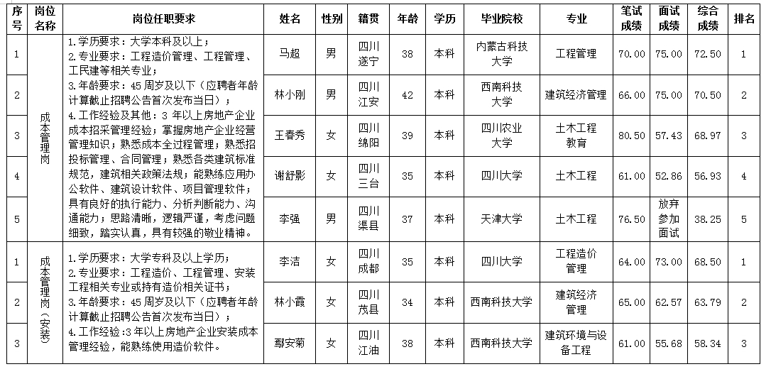 根据绵阳市williamhill官网置地有限公司发布的招聘公告及招聘相关规定,经笔试、面试等程序,现将笔试、面试成绩予以公示。