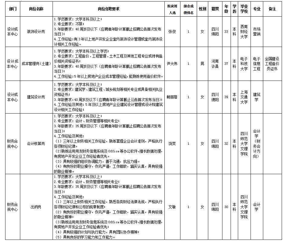 根据绵阳市williamhill官网置地有限公司发布的招聘公告及招聘相关规定,经笔试、面试、考察、体检等程序,拟录用张俊等5名同志到绵阳市williamhill官网置地有限公司工作,现予以公示,具体情况如下: