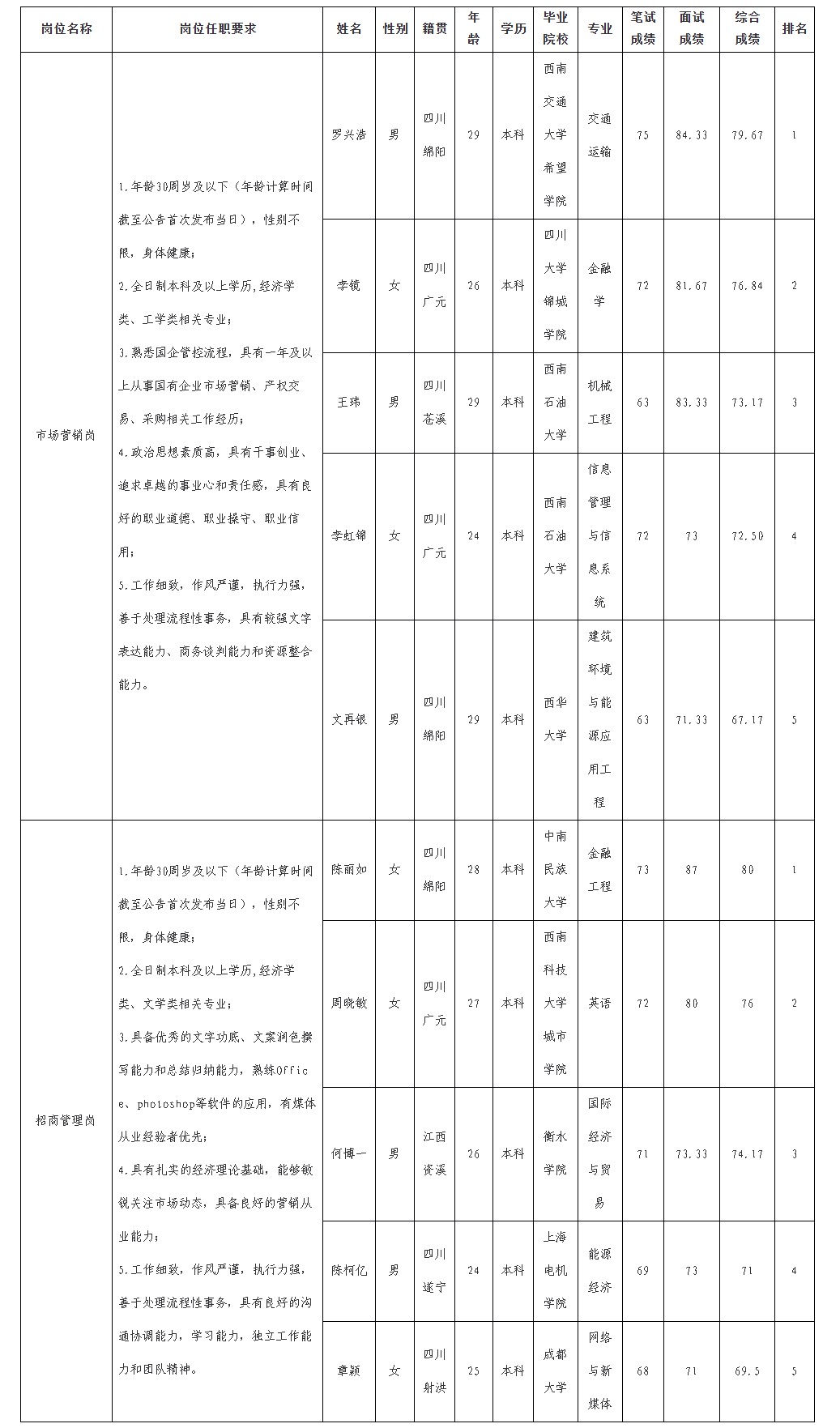 根据绵阳市williamhill官网商业运营管理有限责任公司发布的招聘公告及招聘相关规定,经笔试、面试等程序,现将笔试、面试成绩予以公示。