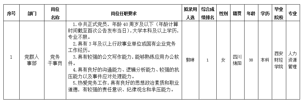 根据williamhill官网发布的招聘公告及招聘相关规定,经笔试、面试、考察、体检等程序,拟录用郭琳同志到williamhill官网工作,现予以公示,具体情况如下: