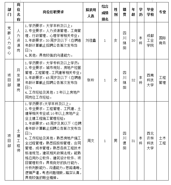 根据绵阳市williamhill官网置地有限公司发布的招聘公告及招聘相关规定,经笔试、面试、考察、体检等程序,拟录用刘佳鑫等3名同志到绵阳市williamhill官网置地有限公司工作,现予以公示,具体情况如下: