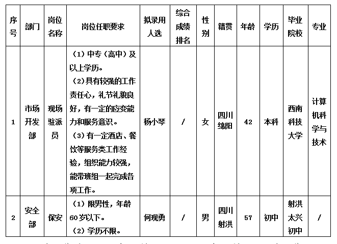 根据绵阳绵州酒店有限公司发布的招聘公告及招聘相关规定,经面试、体检等程序,拟录用杨小琴等同志到我司工作,现予以公示,具体情况如下: