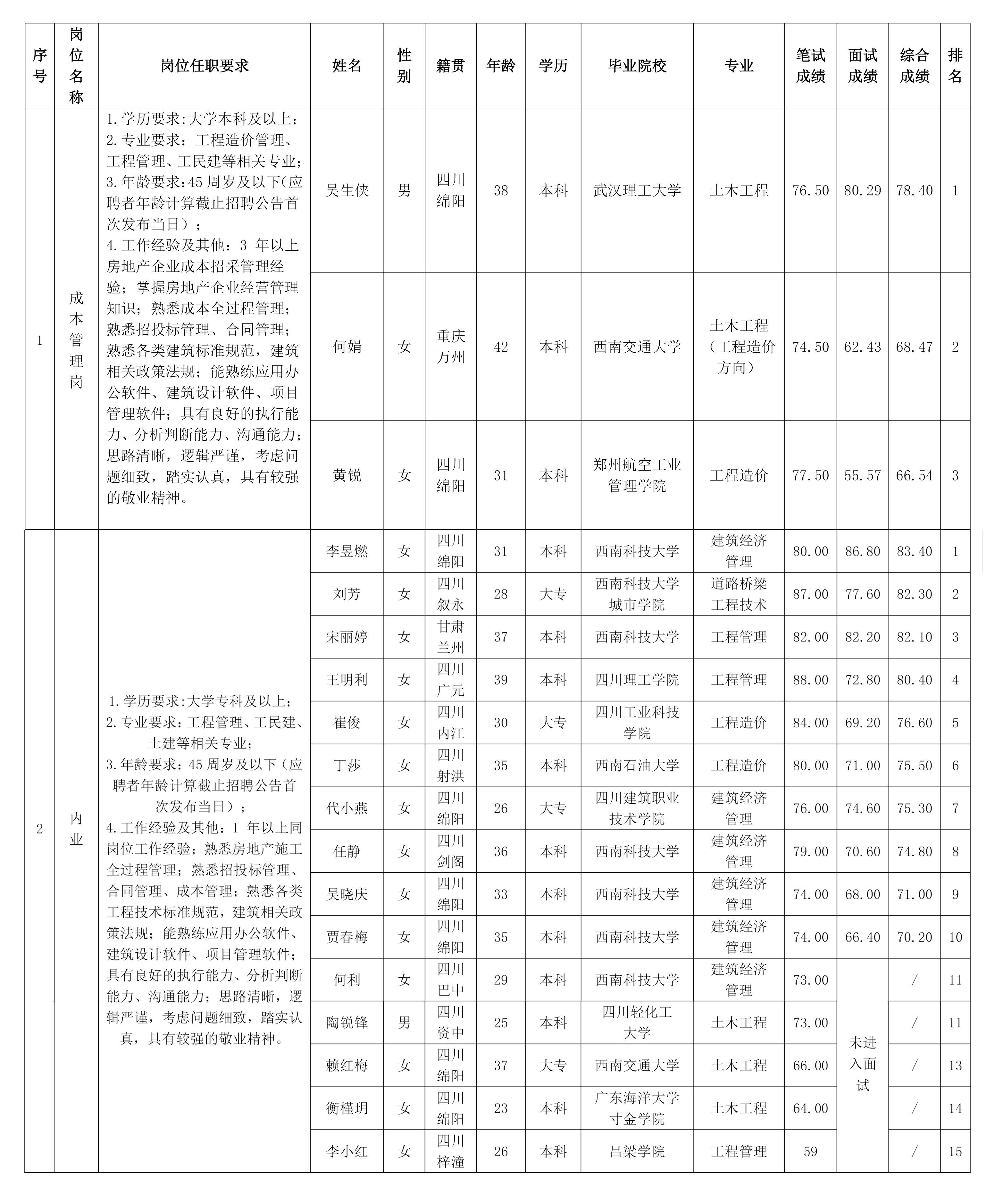 【公开招聘】绵阳市williamhill官网置地有限公司关于成本管理岗等岗位测试成绩的公示