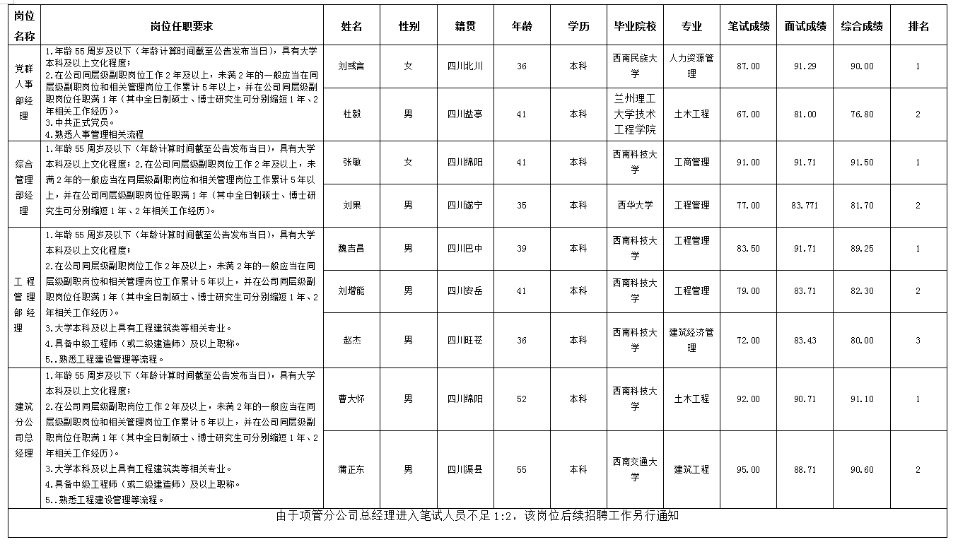 根据四川嘉来建筑工程有限公司发布的中层竞聘公告及相关规定,经笔试、面试等程序,现将综合成绩予以公示。