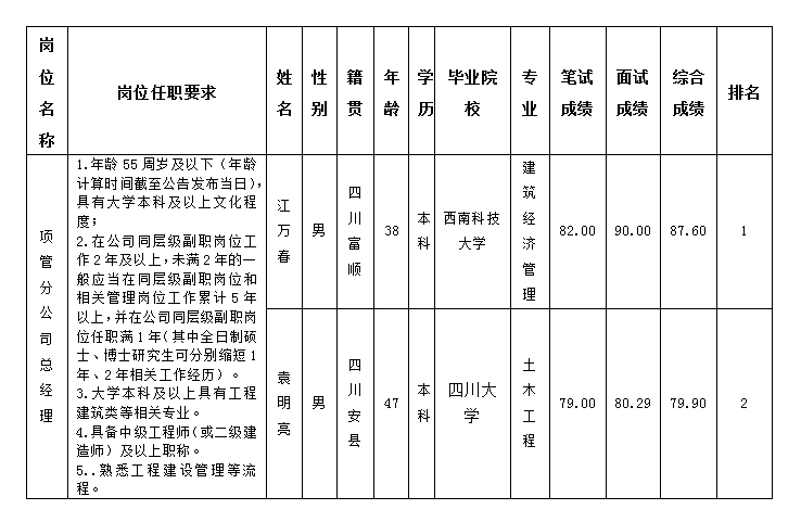 根据四川嘉来建筑工程有限公司发布的延长项目管理分公司总经理岗位报名时间的公告及相关规定,经笔试、面试等程序,现将综合成绩予以公示。