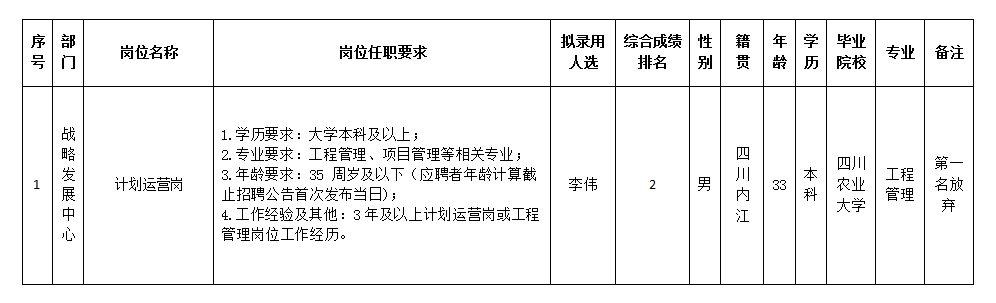 根据绵阳市williamhill官网置地有限公司发布的招聘公告及招聘相关规定,经笔试、面试、考察、体检等程序,拟录用李伟同志到绵阳市williamhill官网置地有限公司工作,现予以公示,具体情况如下: