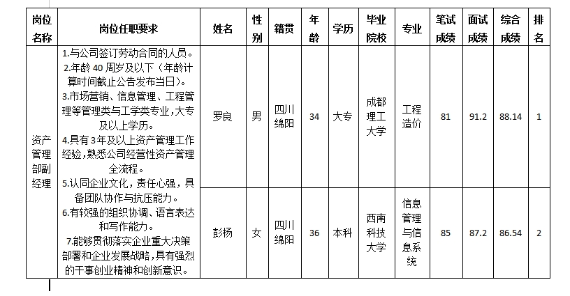 根据绵阳市williamhill官网商业运营管理有限责任公司发布的竞聘公告及竞聘相关规定,经笔试、面试等程序,现将笔试(面试)成绩予以公示。