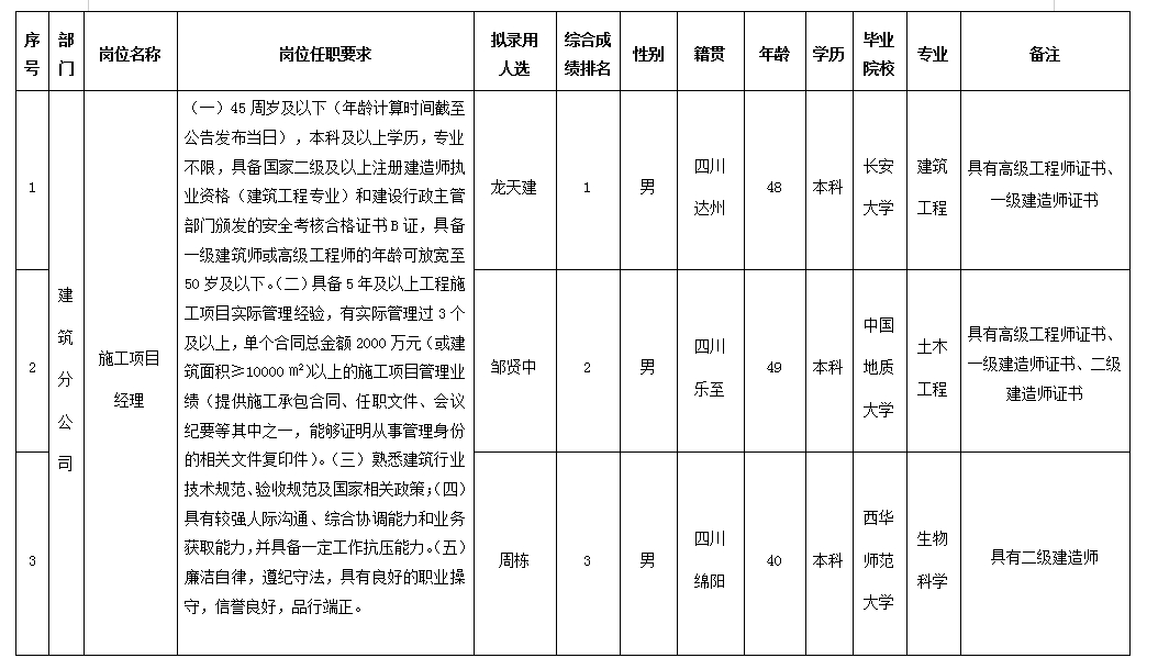 根据四川嘉来建筑工程有限公司发布的招聘公告及招聘相关规定,经笔试、面试、考察、体检等程序,拟录用龙天建、邹贤中、周栋同志到四川嘉来建筑工程有限公司工作,现予以公示,具体情况如下: