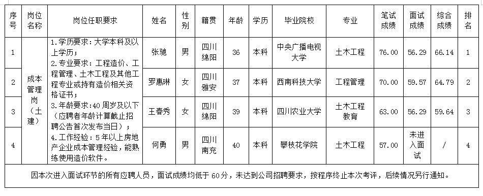 根据绵阳市williamhill官网置地有限公司发布的招聘公告及招聘相关规定,经笔试、面试等程序,现将笔试、面试成绩予以公示。
