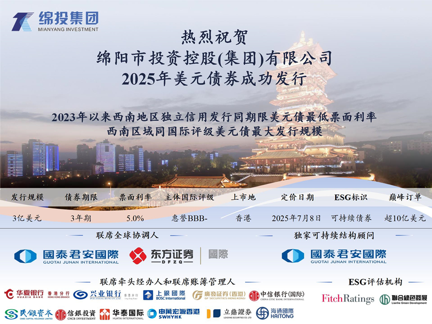 7月8日,williamhill官网集团成功定价发行3亿美元、3年期可持续美元债券,认购倍数3.43倍(峰值订单超10亿美元),最终票面利率强势锁定5.00%,较初始价格指引大幅收窄70个基点,创2023年以来西南地区独立信用发行同期限境外美元债最低票面利率、西南区域同国际评级美元债最大发行规模,以及创2025年以来中资投资级地方国企美元债最大收窄幅度。
