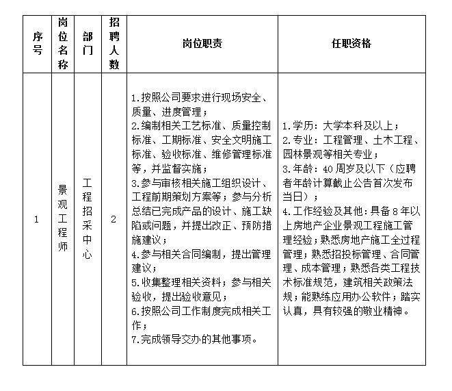 (1)年龄30岁-40岁,大学本科及以上相关专业学历,有园林景观五年以上工作经验,有工程师及以上职称。具有全国注册监理工程师(市政公用)者优先。条件优秀者可适当放宽。
