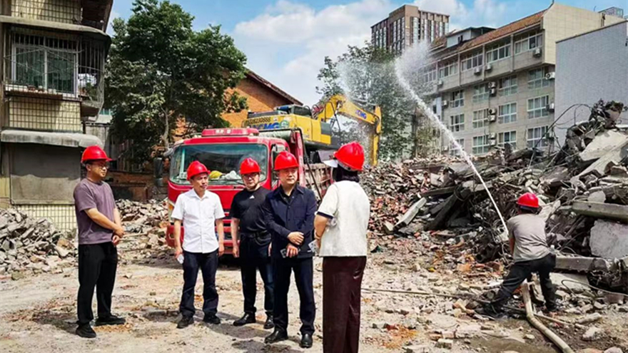 危房紧邻周边住宅,施工空间狭小,拆除难度极大。为确保拆除工作安全有序进行,富达公司多次组织建筑、安全专家现场勘查,研究制定了“机械拆除为主,人工配合为辅”的精细化拆除方案。拆除现场,工作人员设置警戒线封锁拆除区域,专人疏导围观群众,维护现场秩序。伴随着挖掘机的轰鸣声,危房楼体结构在专业人员的精准操控下逐步瓦解,同步实施洒水降尘措施,整个拆除过程安全、有序、环保。